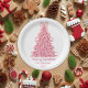 These elegant plates feature a whimsical pink Christmas tree adorned with a big pink bow and pastel ornaments in purple, pink, and aqua, all set against a white background. Below the tree, it reads “Merry Christmas”, followed by a customizable family name and year.