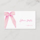The AMORETTE pink bow place card design features a simple, classic design with a white background and a watercolor pink bow with ribbons, paired with a handwritten script font and elegant serif fonts in matching shades of pink. A table number is included in the bottom, which you can include if you are using these as escort cards, or omit if they'll be used as place cards or buffet cards.