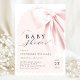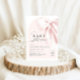 Pink Bow Ribbon Baby Shower Invitation. This elegant invitation features a charming blush pink bow and romantic handwritten script, perfect for a whimsical baby girl shower. The chic ribbon and preppy design add a touch of sophistication, while the editable template allows for easy customization. Create a beautiful and memorable invitation for your special event.