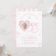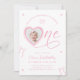 A sweet and elegant first birthday invitation featuring a delicate pink bow theme and a charming heart photo frame.