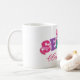 Girly graduation coffee mug for a senior with SENIOR written in colorful varsity letters, with a bow on top with its ribbons curling around the letters. Personalize with the year in a pretty hot pink script.
