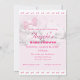 Design features a light pink background to the image of a pink bow amid white puffy clouds. Top and bottom are bordered by white with the images of tiny pink bows. Text is featured in a bright pink, the name of guest of honor in a large, elegant font. Event type is displayed in a large, bold font. Date and time are displayed below in an easy-to-read print. R.S.V.P. information is displayed at bottom.