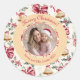 We love pink bows and ribbons! We bet you do, too. Beautifully decorated gold Christmas bells go together wonderfully. This classic holiday round sticker features your fine photo in a round frame with the lovely vintage watercolor pattern. Around the picture is the "Merry Christmas" greeting, as well as example names and year. Be sure to edit those "from" names and date to your own choices. Such a nice sticker for your holiday cards, envelopes, gifts, and packages.