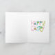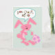 The front of this Easter season greeting card shows a bright pink rabbit holding a teal green striped Easter egg. Beside him is a pink and violet dotted egg. Above the bunny is a talk bubble that says You Crack Me Up. Cute! The image is placed on a light teal green background. Inside the card is artistic text in bright colors that says Happy Easter. *Clip art used in this design is copyrighted by Encore Software, Inc., which permits use to its licensors. All rights reserved.