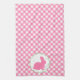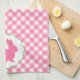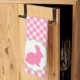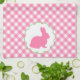 The silhouette of a cute pink bunny sits inside a white flower frame with a spring green border. Sweet, pink and white gingham checks make up the background.