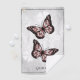 Personalize a unique towel for golfing with a Pink Butterfly Floral Personalized Golf Towel. Towel design features a pair of vibrant butterflies resting on a white floral vine against a light grey grunge background. Additional gift items available with this design as well as a variety of colours.