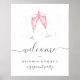 Festive and elegant welcome sign for your engagement party or wedding features a pair of clinking champagne glasses in watercolor, filled with pink bubbly. Personalize with three lines of custom text beneath; shown with "welcome" and the couple's names and event type.