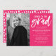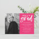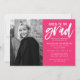 Invite guests to celebrate the graduate with our Cheers to the Grad graduation party invitations. The modern graduation party invites feature the graduate's vertical photo on the left. "Cheers to the grad" is displayed in a white, hand-lettered brush script with a hot pink background. Personalize the front of the invite by adding the graduate's name, school name, graduation year, and party details. The invite reverses to display a hot pink and white abstract dot pattern.