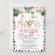 Pink Cheetah Print Four Ever Wild 4th Birthday Invitation Girl's safari quatre fois sauvage invitation de quatrième anniversaire avec un léopard ou un motif imprimé de guépard autour du bord et un arrangement floral tropical au sommet. Idéal pour une fête de quatrième anniversaire sur le thème du safari.