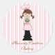 Cute round bakery business stickers done in a pink and white striped background. Adorable graphics of a girl chef, wearing a pink apron and chef hat, is holding a colourful cupcake. Brown script text, on the bottom, is ready to personalize to suit your needs.