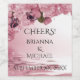 Beautiful wedding design features pink cherry blossoms in across the top and left and slightly down the left hand side. There are two pink and black butterflies sitting on the pink cherry blossom flowers. The background of the design is a very light pink that with a darker pink water like design at the bottom. There is fully customizable text in black font that says Cheers! and has a place for the couples names and wedding date. This wine bottle label is the perfect match to our Pink Cherry Blossoms and Butterflies Wedding invitations.