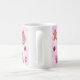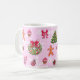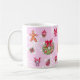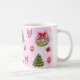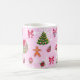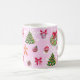 Pink mug with snowflakes, gingerbread men, wreath, presents, poinsettias, bows, cupcakes, ornaments.