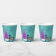 These paper cups are a vibrant teal colour with a pink and silver Christmas tree on star white rug, purple and green wrapped gifts and cute black cat wearing a pink bow with the text Merry Christmas in festive colourful letters.