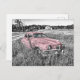 A stunning pink vintage, classic car in front of a black and white background makes for a unique design