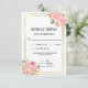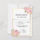 Beautiful RSVP card features a gold foil frame with pink coral watercolor roses and pale green botanical branches. This version includes meal options for your guests to select. Reverse side is a coordinating pale pink with a small group of flowers in the centre.
