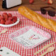 A playful design with a woman’s legs kicking up her cowboy boots, surrounded by retro stars. A pink cowboy hat adds a fun touch, while a vase of flowers and pink Champagne with glasses set the perfect celebratory tone. The background is a whimsical pink cow print.
