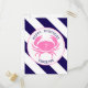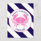 A birthday postcard invitation featuring an illustration of a pink crab with blue striped background. Personalize all text.
