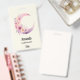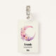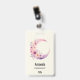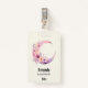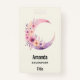 Name tag with a lovely illustration featuring a soft pink and purple crescent moon. Pretty pink and yellow wildflowers adorn this celestial body.
