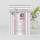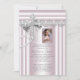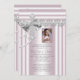 Pink photo first communion invitations with lace swirls and pearly cross on a beautiful silver gray and pink lace background. This pretty pink photo first communion invitation is easily customized for your event by adding your event details, font style, font size & color, and wording. You can crop your photo and move the frame to wherever you need, as we as make it smaller or larger. This is a printed design with no real ribbons, bows, pearls, glitter, etc.