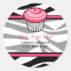 A sticker featuring an illustration of a hot pink cupcake with matching trim. Background is black zebra print.  Look for matching items such as invitations in the "Birthday Shop" category of The Pink Schoolhouse store.