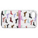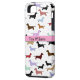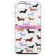 A great iPhone case that is perfect for any dog lover. It features a white background with little weenie dogs all over it. A pink stripe runs through the centre. You customize the text in the centre.