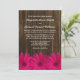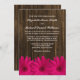 A country themed wedding invitation featuring pink daisies on a rustic dark brown barn wood background. Perfect for a country wedding, barn wedding, western wedding and more. Easily personalize for your event!