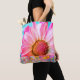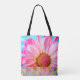 A bright pink daisy against a bright blue background. The bottom of the tote is decorated with a water colour polka dot pattern.
