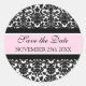 Save the Date envelope seals for wedding, in elegant light pink, black and white classic floral damask pattern, the perfect addition to your save the date card envelopes, available in matching cards and magnets.