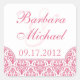 This square sticker matches our Pink Damask Wedding Set perfectly! It is a pretty shade of pink in a classic, damask pattern. This could be used as an envelope seal, for party favours, thank you gift tags, or a gamut of other uses related to wedding festivities. Endless uses for this elegant design.
