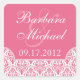 This square sticker matches our Pink Damask Wedding Set perfectly! It is a pretty shade of pink in a classic, damask pattern. This could be used as an envelope seal, for party favours, thank you gift tags or a gamut of other uses related to wedding festivities. Endless uses for this elegant design.