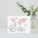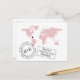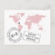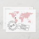 Blush rose gold pink and white cute, funny, and humourous change the date announcement postcard for a destination wedding that's been moved to a new location, rescheduled, or delayed because of travel restrictions and coronavirus quarantine, while trying to keep a positive attitude and adding a little fun within the personalized text on the passport stamps on the world map and editable heart location. ALL COLORS OF THIS TEMPLATE CAN BE EDITED TO MATCH YOUR COLOR THEME - just click 'customize futher' and click the layers to adjust the fill colours and move the heart location.