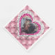 These custom napkins feature a Valentine love or wedding theme with a photograph heart frame. The background is a soft pink cushion pattern with pink diamonds & silver mosaic frame. A sample photo of a married or engaged couple is placed in the centre.