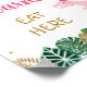 The design features pink dinosaurs with tropical watercolor leaves, gold glitter leaf embellishments and gold glitter confetti.