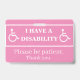 Pink Badge. I have a disability. Please be patent. Alert others to unseen disabilities. Give this to mom, sister, grandma, friend, child, more. They can wear in public to let everyone know they may need a little more time than others. Personalize, Erase the back and add your own words. Can add a name, emergency phone number, or alert for illness or condition. Choose edit. Thoughtful gift.