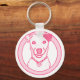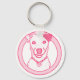 A keychain featuring a pink and white photo of a Jack Russell Terrier peeking out from a matching circle shaped frame.