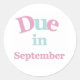 A cute maternity design on T-shirts, buttons, mugs, tote bags, and other items, great for the pregnant mom to be and also the dad to be with pink text design that reads "Due in September"!