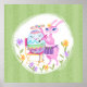 A happy, pink, Easter bunny rabbit decorate's an Easter egg using an assortment of baby blues, lavender and lemon grass green paint colours. Original illustration by Noël Snow