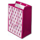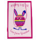 This fun Easter gift bag is fully customizable, just type in the boxes to change the greeting and the name or other text. The default in deep pink script is "HAPPY EASTER" and "Love from Grandma". The background is pale pink, and the cheeky easter egg shaped bunny has stripes and patterns in pink, blue and yellow.