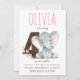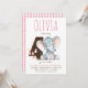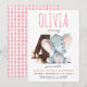This invite features a pink elephant for a fourth birthday party. Back of invite has a pink gingham pattern. Personalize the invite with your details and you have the options to purchase printed invitations or a digital download.