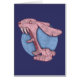 Angry, pink, cartoon bunny rabbit with wide open mouth with long fangs, on a blue circle, heavily age distressed. T-shirts, gifts.