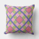 A chic Throw Pillow or Cushion, with a pretty faux-patchwork pattern of deep pink, violet blue and yellow primroses on a leafy green background, with deep pink and white check gingham and polka dots; from the Posh & Painterly "Primroses" collection.