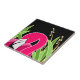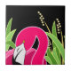 Abstract stylized flamingo bird on black background surrounded by decorative leaves