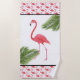 This beach towel is shown in a tropical pink flamingo print design.