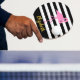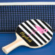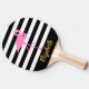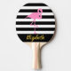 A pink flamingo appears on this ping pong paddle that has black and white stripes. You can customize your ping pong paddle with your name at the bottom in faux (not foil) gold script.