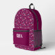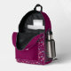 This backpack features a pink flamingo design and name. It has a cute red pattern that enhances the visual appeal. The design is printed directly on the backpack material, with the pink flamingo as the main element. The red pattern complements the flamingo, contributing to the overall look of this printed backpack.