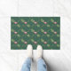 An arty little floor mat using water color pink flamingos and tropical foliage in a formal design on practical dark green.