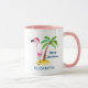 Personalized mug with a cute illustration of a pink flamingo wearing a red santa hat. Standing on a mound of sand with a tropical palm tree behind. perfect for a tropical christmas.