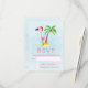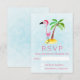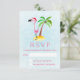 An RSVP card with a whimsical drawing of a pink flamingo wearing a red santa hat. Standing on a mound of yellow sand with a green and brown coconut palm tree in the back. Light blue background.