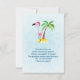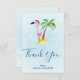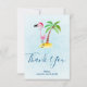 A flat thank you card with a whimsical drawing of a pink flamingo wearing a red santa hat. Standing on a mound of yellow sand with a green and brown coconut palm tree in the back. Light blue background. Cute and fun festive design.