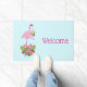 A doormat with a tropical themed Christmas flamingo wearing a pink santa hat. Underneath its feet is a candy cane bouquet with pretty tropical flowers and pink berries. A sprig of holly on its chest.